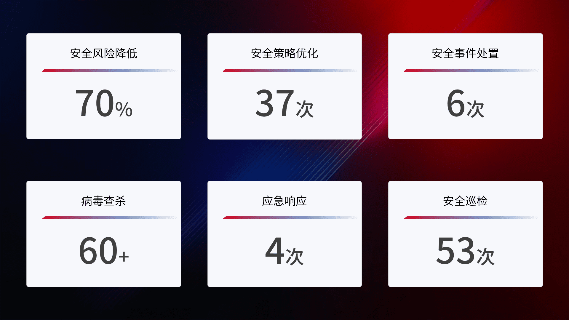 提供全面的安全事件报告体系,,,,包括处置报告、、、、周报、、季度和年度总结,,,结合持续监控,,,,帮助客户深入了解网络安全状况。。